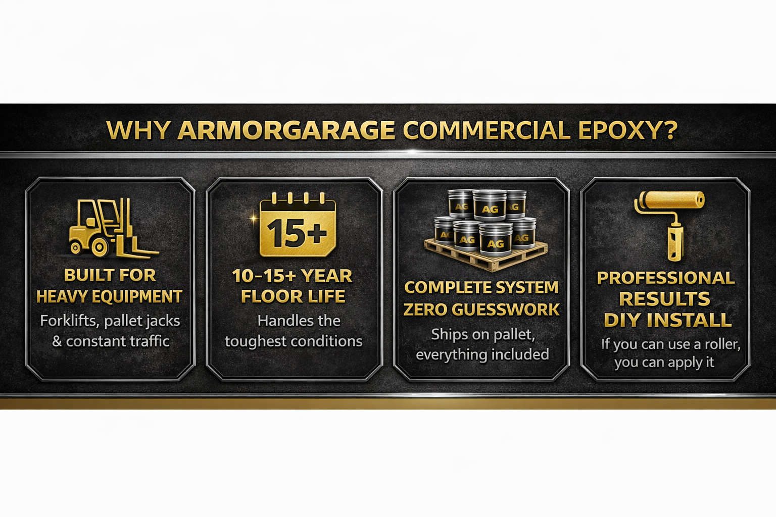 The ArmorGarage Large Format Commercial Epoxy System is a seamless, two-layer (primer + topcoat), high-gloss, high-performance coating solution for floors 1,500 square feet and larger. These coatings resist heavy forklift traffic, chemicals, impacts, and stains while delivering a long-lasting, easy-to-maintain surface — at a fraction of contractor pricing.