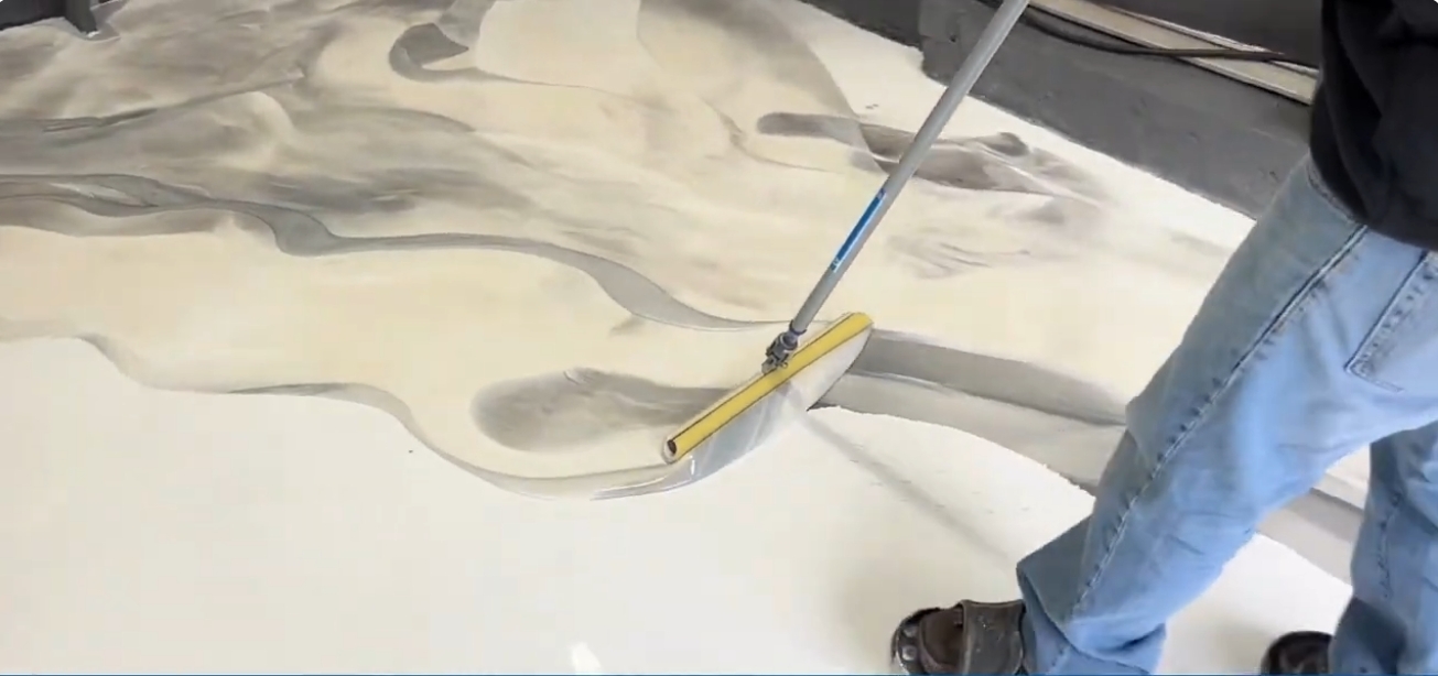 Man applying accent color to a decorative swirled metallic epoxy floor