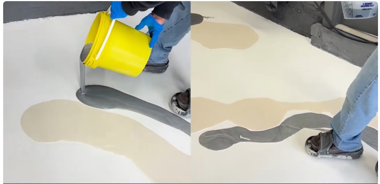 5. Mix your A and B together at the 2:1 ratio. Pour it on the floor in a ribbon left to right. Have your magic squeegee ready to go to spread it out evenly over the primer. Spread epoxy at about 100 sf per gallon rate with squeegee do not over work it. You can slightly twirl the squeegee while spreading. After it's spread, spraying on denatured alcohol from a hand pump sprayer or spray bottle can make the epoxy ‘dance and swirl’, do this after you spread epoxy out.