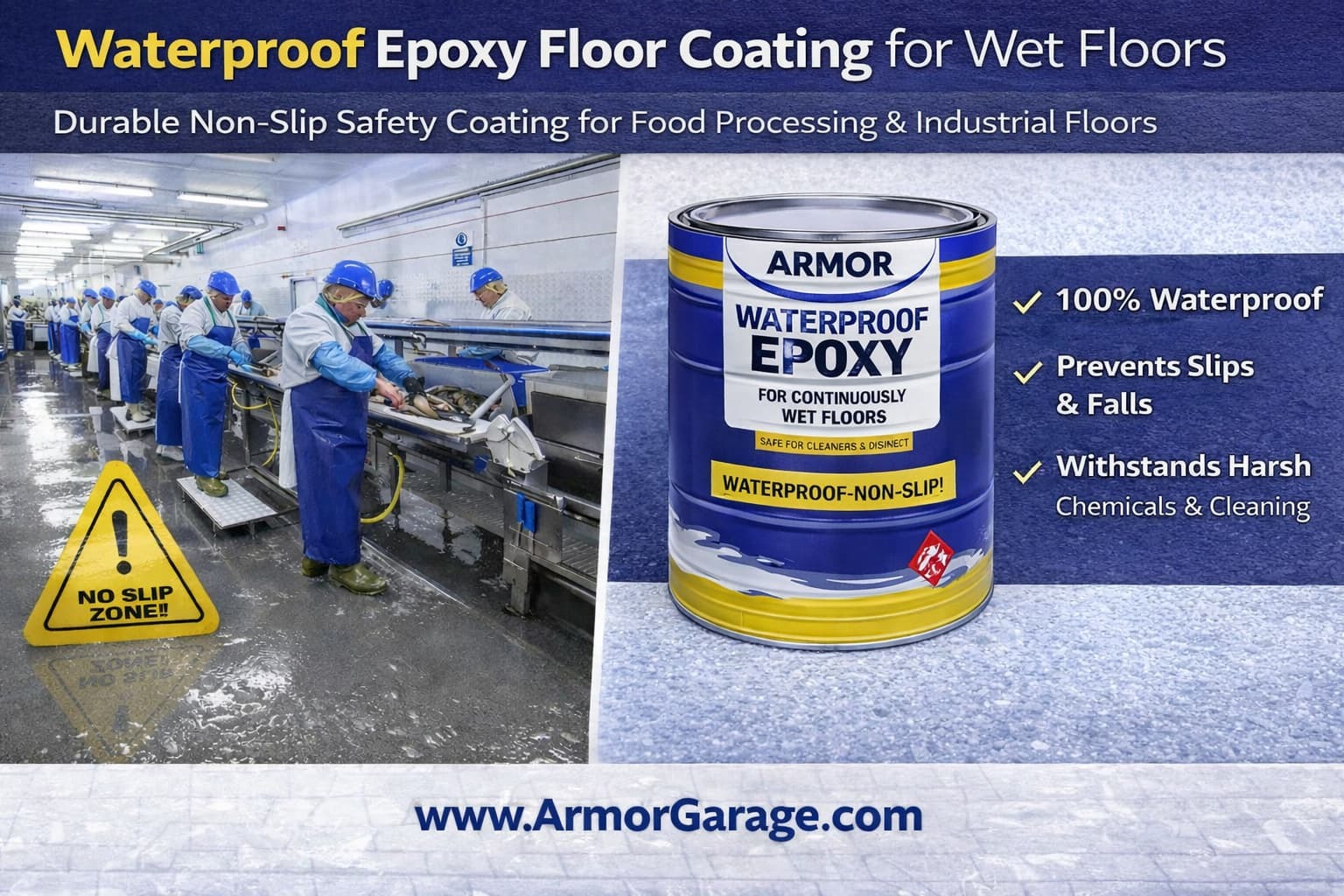 You must use an epoxy specifically designed for continuous wet and caustic environments. ArmorGarage Wet Processing Epoxy is formulated to solve this exact problem — standard products are not engineered for this and will fail.